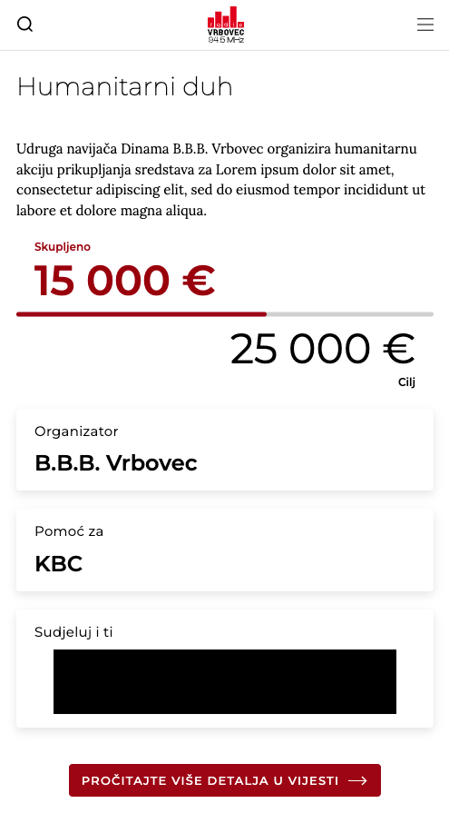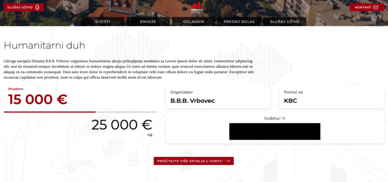 Kreirat ćemo sekciju s brojačem skupljenog iznosa do određenog cilja, stavit ćemo kratki opis i barkod za uplatu i povezati to s člankom u kojem će pisati baš svi detalji o akciji.